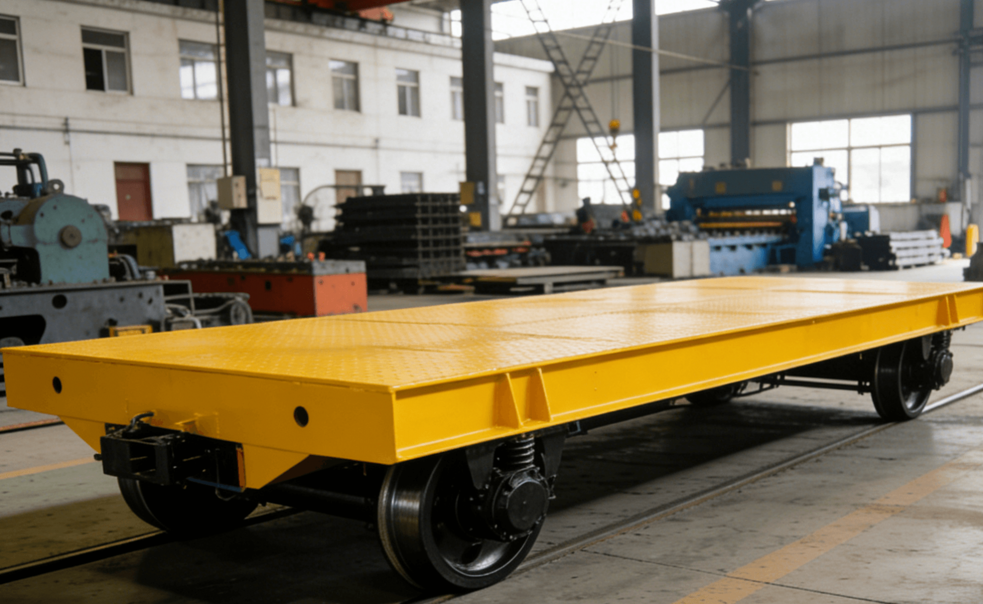 Transfer of castings, forgings, mechanical parts and large equipment between workshops. Cooperate with overhead cranes to realize efficient cross-bay transportation and optimize production line flow — a key material handling solution for machinery factories.